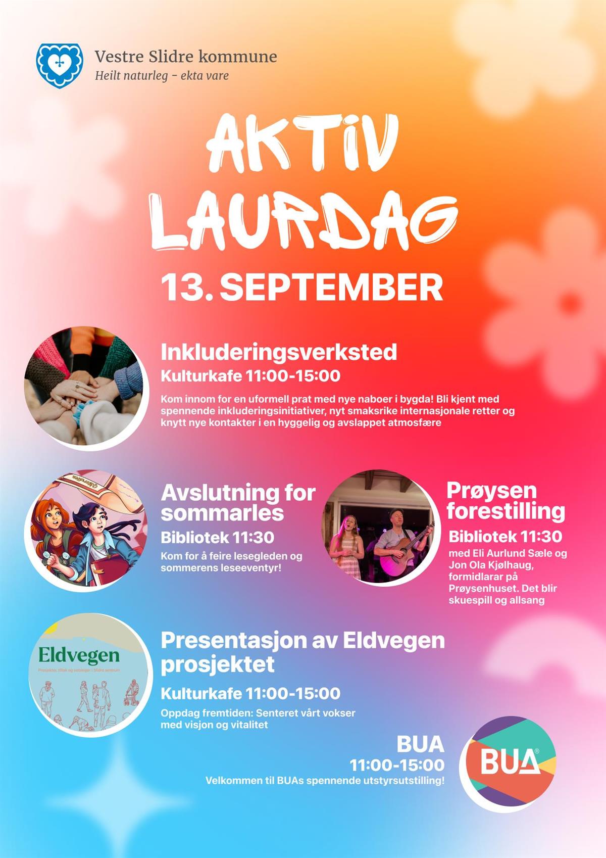 «Vi ønskjer at Aktiv laurdag skal vere ein inkluderande og inspirerande dag der både fastbuande og tilflyttarar kan møtast, dele opplevingar og bli betre kjende. Programmet er variert, og vi trur det vil vere noko for alle,» seier arrangørane.