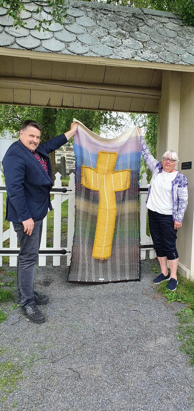 Margit Bratvold i Styret for Knut Lahaug sin stiftelse for bårehus/kyrkjestogo overrakte ei gåve til det nye bygget under kommunestyret sitt møte Vestre Slidre i dag. Gåva var eit fint båreteppe, vove av Marit Anny Løken Tvenge, som er gjeve av Inga Holden til minne om Inga f. Frigstad og Jørn Wangensten Holden og deira etterkomarar. Båreteppet vil finne sin plass i det nye bygget når det står ferdig. Kyrkja er og takksame for det flotte teppet – det blir fint å smykke det nye bygget med når det er ferdig, seier kyrkjeverge Veslemøy Kvamme