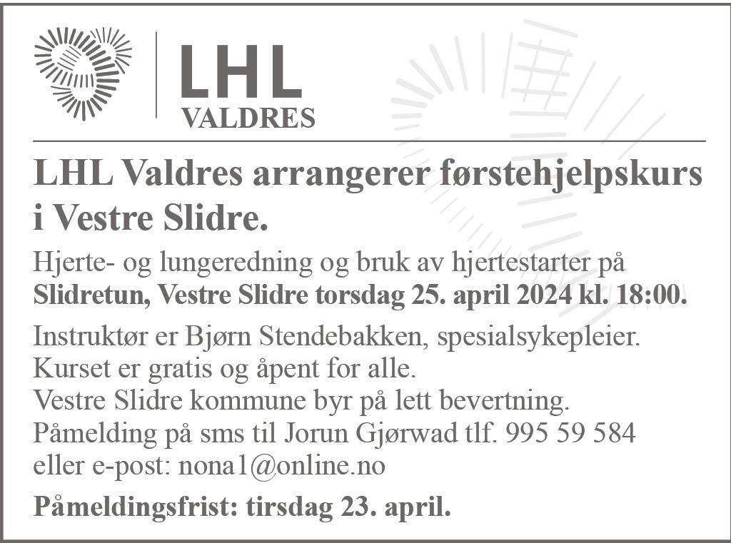Gratis fyrstehjelpskurs i regi av LHL torsdag 25.april kl 1800LHL arrangerer gratis fyrstehjelpskurs på Slidretun torsdag 25.april kl 1800. Sjå annonse nedanfor. Påmelding er fortsatt mogleg. Sist endra 23.04.2024 16.02