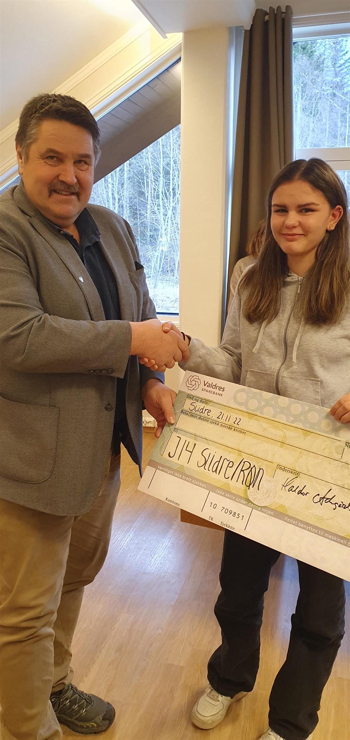 Mali Gustavsen tek i mot sjekk på vegne av laget. Ordførar Haldor Ødegård delar ut.