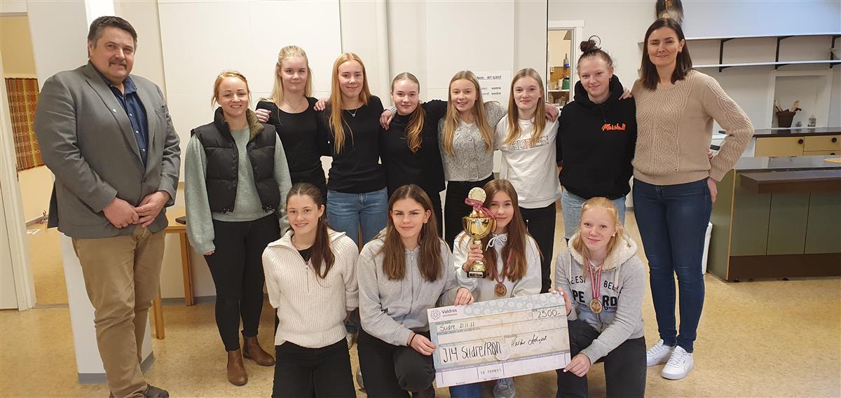 Ordførar Haldor Ødegård er stolt og imponert over laget sin prestasjon og heidra dei med marsipankake og ein gavesjekk på kr 2500.