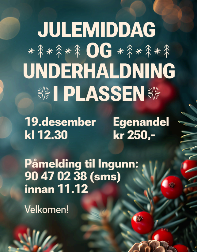 Julemiddag og underhaldning i Plassen Tid: 19.desember kl. 12:30. Påmelding til Ingunn, 90 47 02 38 (sms) innan 11.12. Egenandel kr 250,- Velkomen! Sist endra 27.11.2025 14.38