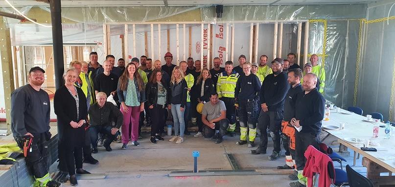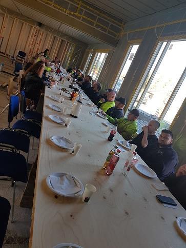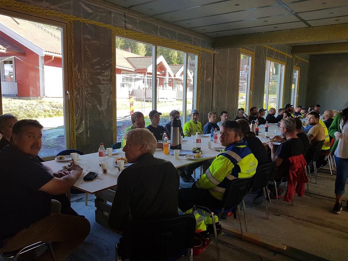 I samarbeid med entreprenøren, Sanne Hauglid AS, var alle som arbeider med det nye Helsetunet i Vestre Slidre, invitert til felles lunch på byggeplassen tirsdag 6. september. Dette for å markere at taket er ferdig, noko som tradisjonelt har blitt feira med mønaskål/kranselag. ‘Styrkedrikk’ var denne gongen bytta ut med rundstykker, kringle, kaffe og mineralvatn, som tilsynelatende fall i god smak. Ordføraren innleia med å takke for vel utført jobb så langt, der både framdrift og økonomi er under god kontroll. Kommunedirektøren fulgte opp med å skryte av samarbeidet med entrepenøren, der tonen er god og vilja til å finne løysingar er til stades. Kvar enkelt som arbeider med bygget fekk så kvar sitt gavekort frå kommunen, som dei kan bruke fritt i butikkar på Fagernes. Markeringa vart avslutta med ei runde rundt i bygget der leiinga i SH og VSK deltok. Konklusjonen er at dette ser veldig bra ut!