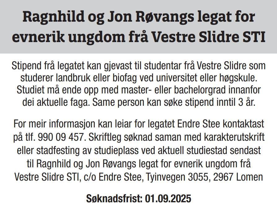 For meir informasjon kan leiar for legatet Endre Stee kontaktast på tlf. 990 09 457. Skriftleg søknad saman med karakterutskrift eller stadfesting av studieplass ved aktuell studiestad sendast til Ragnhild og Jon Røvangs legat for evnerik ungdom frå Vestre Slidre STI, c/o Endre Stee, Tyinvegen 3055, 2967 Lomen