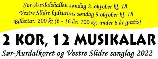 Kjente perler fra 12 musikaler blir framført med stor entusiasme av de glade sangerne i Sør-Aurdalkoret og Vestre Slidre Sanglag søndag 9. oktober i Vestre Slidre kulturhus kl. 18.00. Søk etter Konserter Vestre Slidre Sanglag på Vipps, eller kjøp billettene dine ved inngangen.