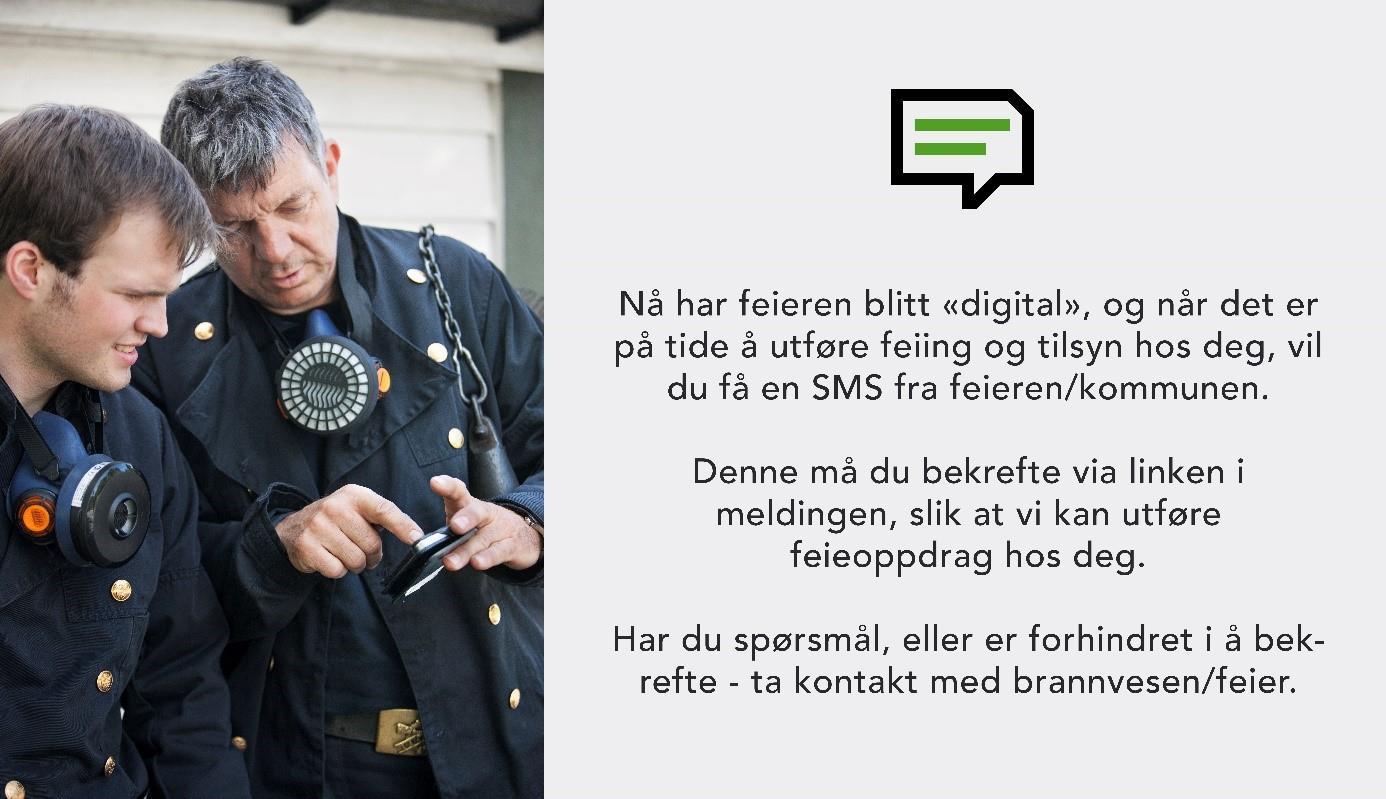 Det du som innbygger skal være forberedt på, er at vi fra nå av kommer til å kontakte dere via SMS på din telefon. Denne tekstmeldingen vil inneholde en link som vi vil at dere tar i bruk. Er du usikker på dette og trenger hjelp, kan du fortsatt kontakte feier slik det er beskrevet i SMS-en. Denne linken kan du enkelt åpne på din Smarttelefon, eller du kan kopiere eller skrive URL’en inn på din PC hvis du ønsker det. Så vil linken ta deg til en plattform som kalles «Min Eiendom», og er en hjemmeside med all din eiendomsinformasjon, her vil du kunne logge deg inn og alltid være oppdatert på bl.a. Brannforebyggingsstatus på din bolig.